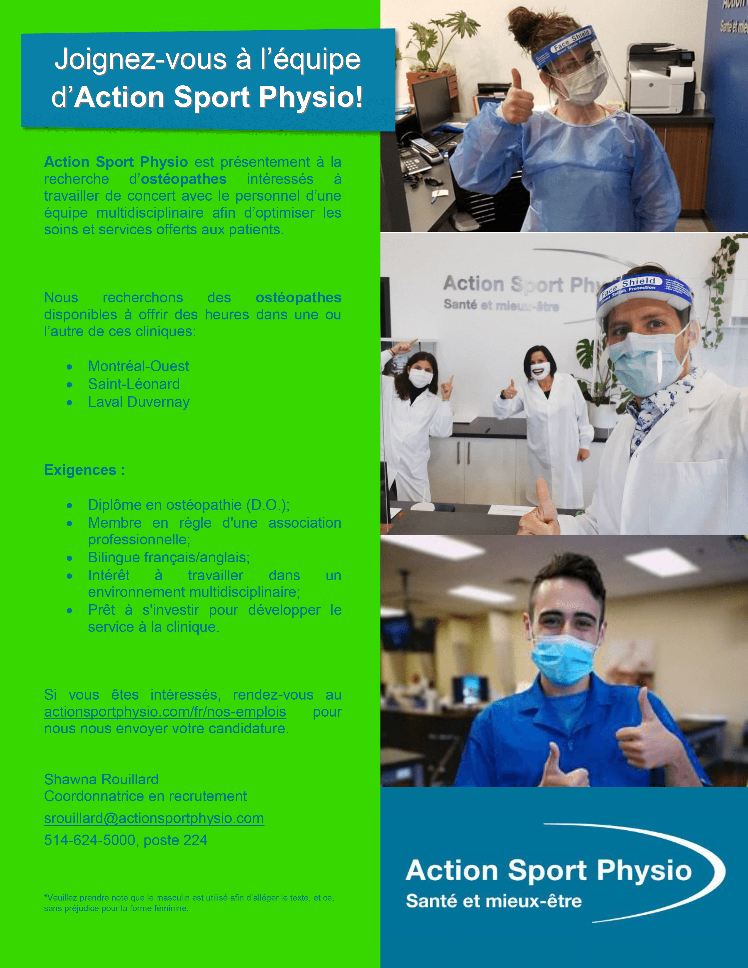 Personne à contacter : Shawna Rouillard, Coordonnatrice en recrutement srouillard@actionsportphysio.com – 514-624-5000, poste 224 |